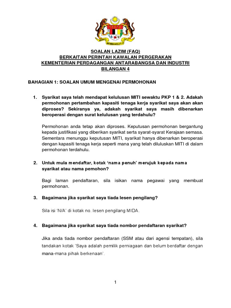 Kementerian perdagangan antarabangsa dan industri (miti) mengeluarkan soalan lazim kepada industri dan sektor perkilangan berkaitan perintah kawalan pergerakan.